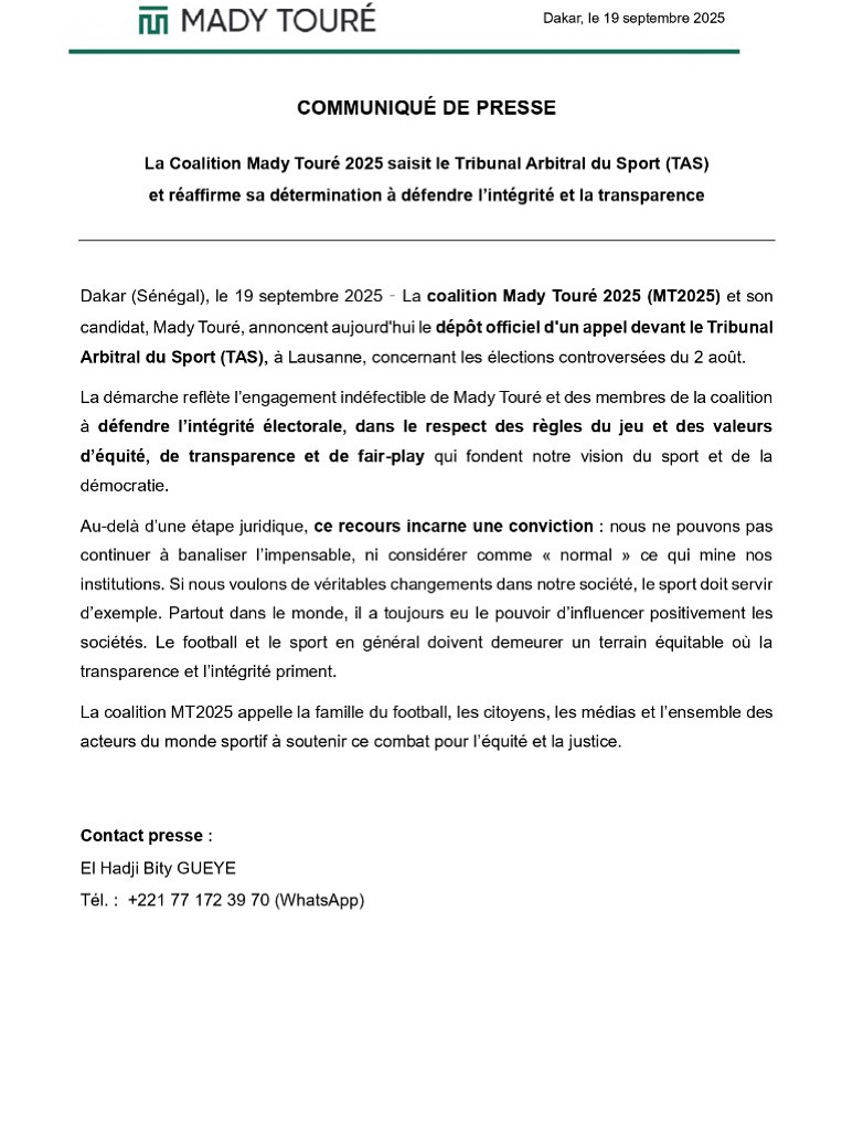 La coalition Mady Touré 2025 a franchi une nouvelle étape dans sa contestation des élections du 2 août dernier. Elle a annoncé avoir déposé un appel auprès du Tribunal Arbitral du Sport (TAS), à Lausanne.